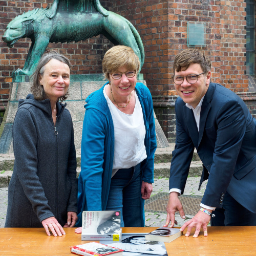 Der LBpB, die AKJS und die Offene Kirche St. Nikolai holen gemeinsam im Herbst 2025 die Ausstellung "Deine Anne. Ein Mädchen schreibt Geschichte" nach Kiel. v.l.n.r.: Kathrin Gomolzig (Aktion Kinder- und Jugendschutz SH, Koordinatorin der Ausstellung in Kiel), Pastorin Maren Schmidt (Offene Kirche St. Nikolai) und Dr. Christian Meyer-Heidemann (Landesbeauftragter für politische Bildung)